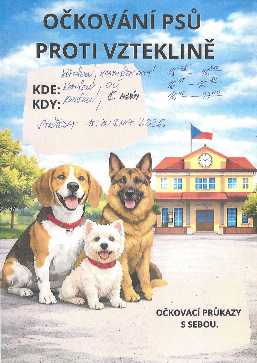 Ve středu 15. dubna 2026 proběhne v Komárově každoroční očkování psů proti vzteklině a to na těchto místech: